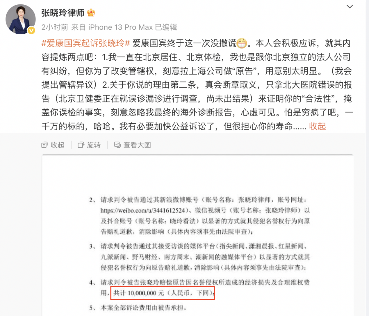 张晓玲律师在微博写道:爱康国宾终于这一次没撒谎,本人会积极应诉。对于1000万元的索赔金额,张晓玲律师表示:“怕是穷疯了吧,一千万的标的,我有必要加快公益诉讼了。”